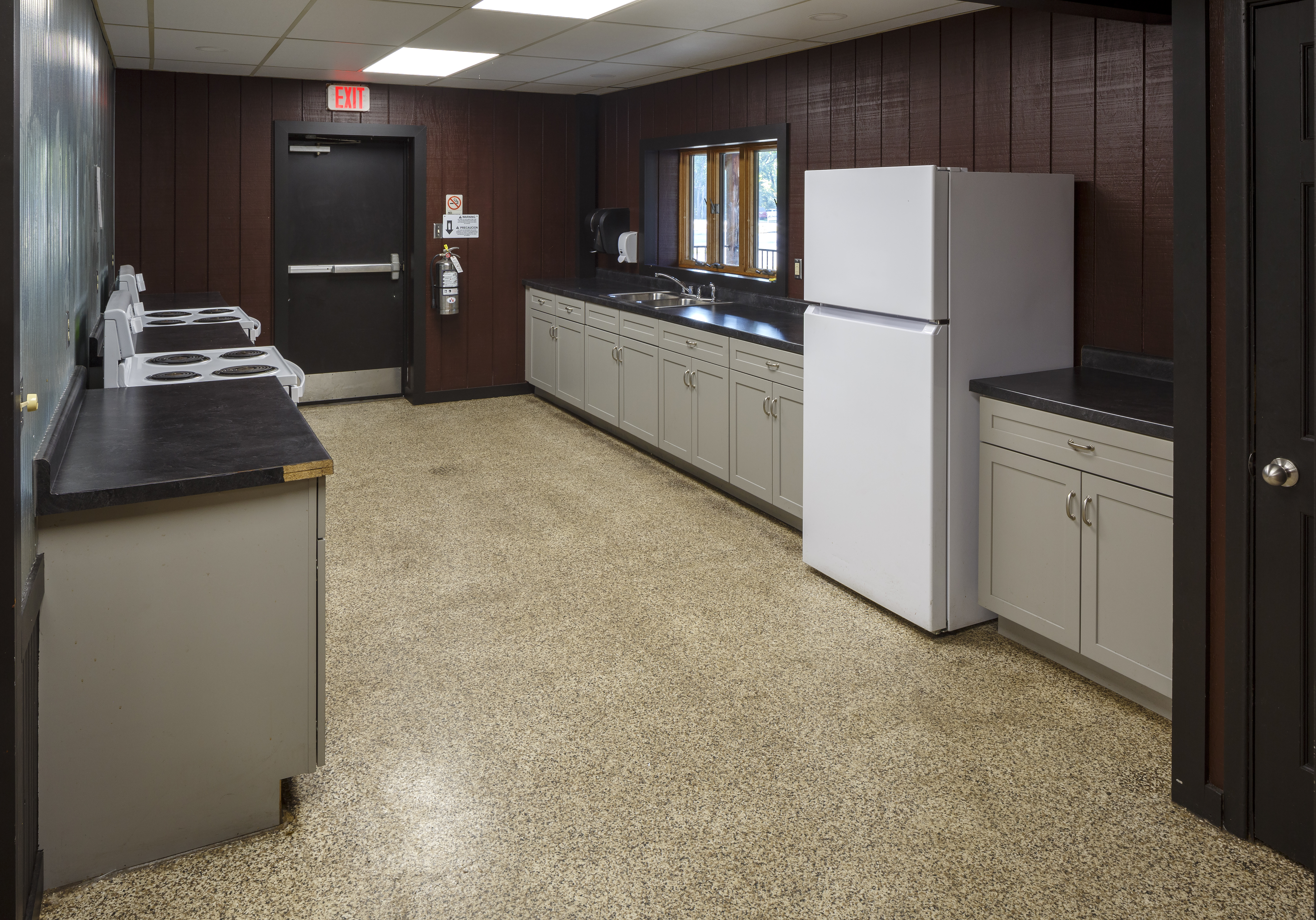 - Full kitchen with two stoves, ovens, and one refrigerator