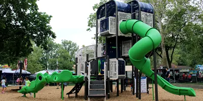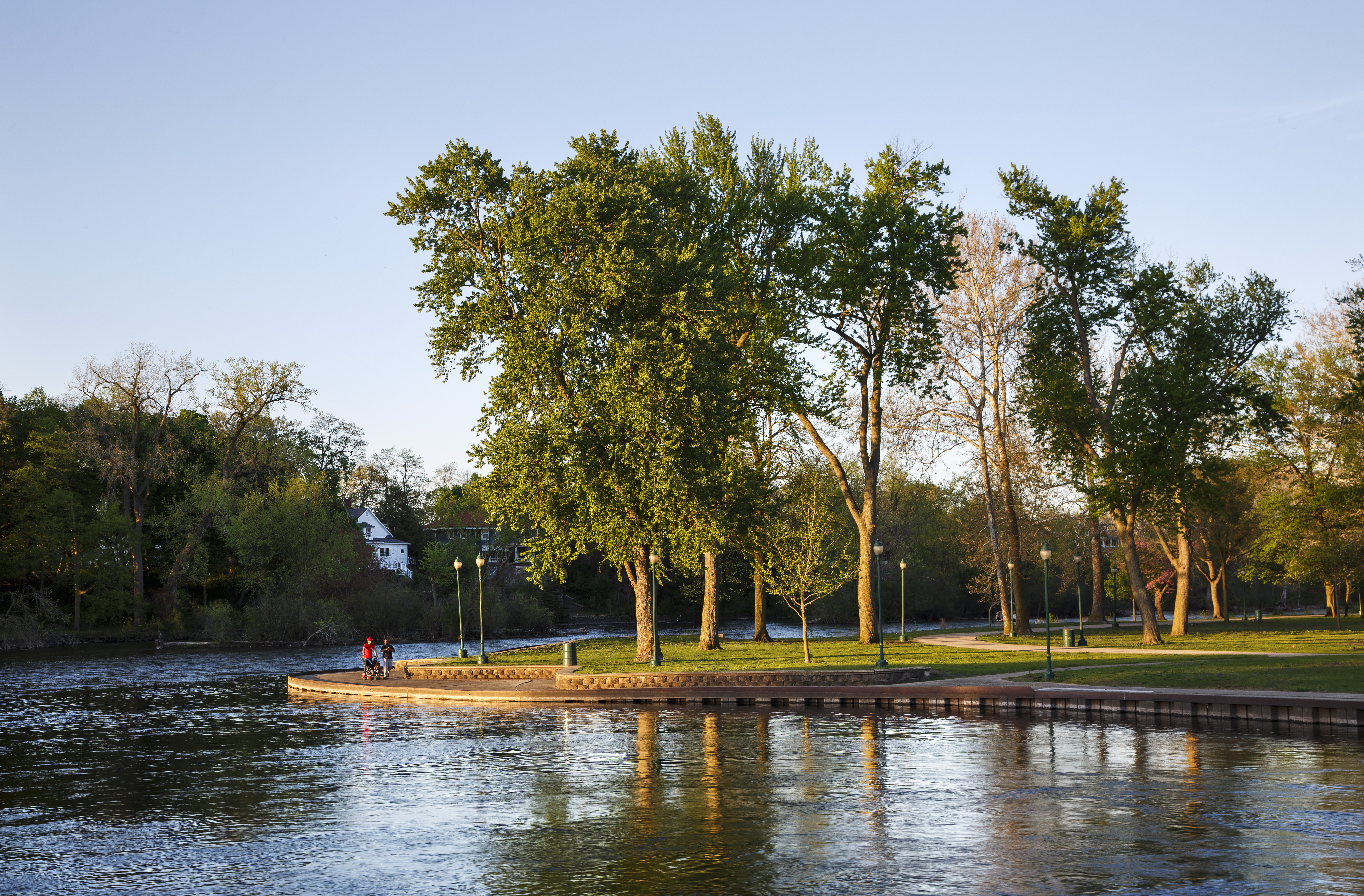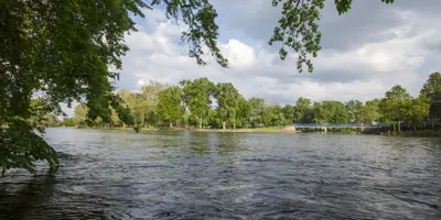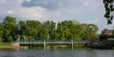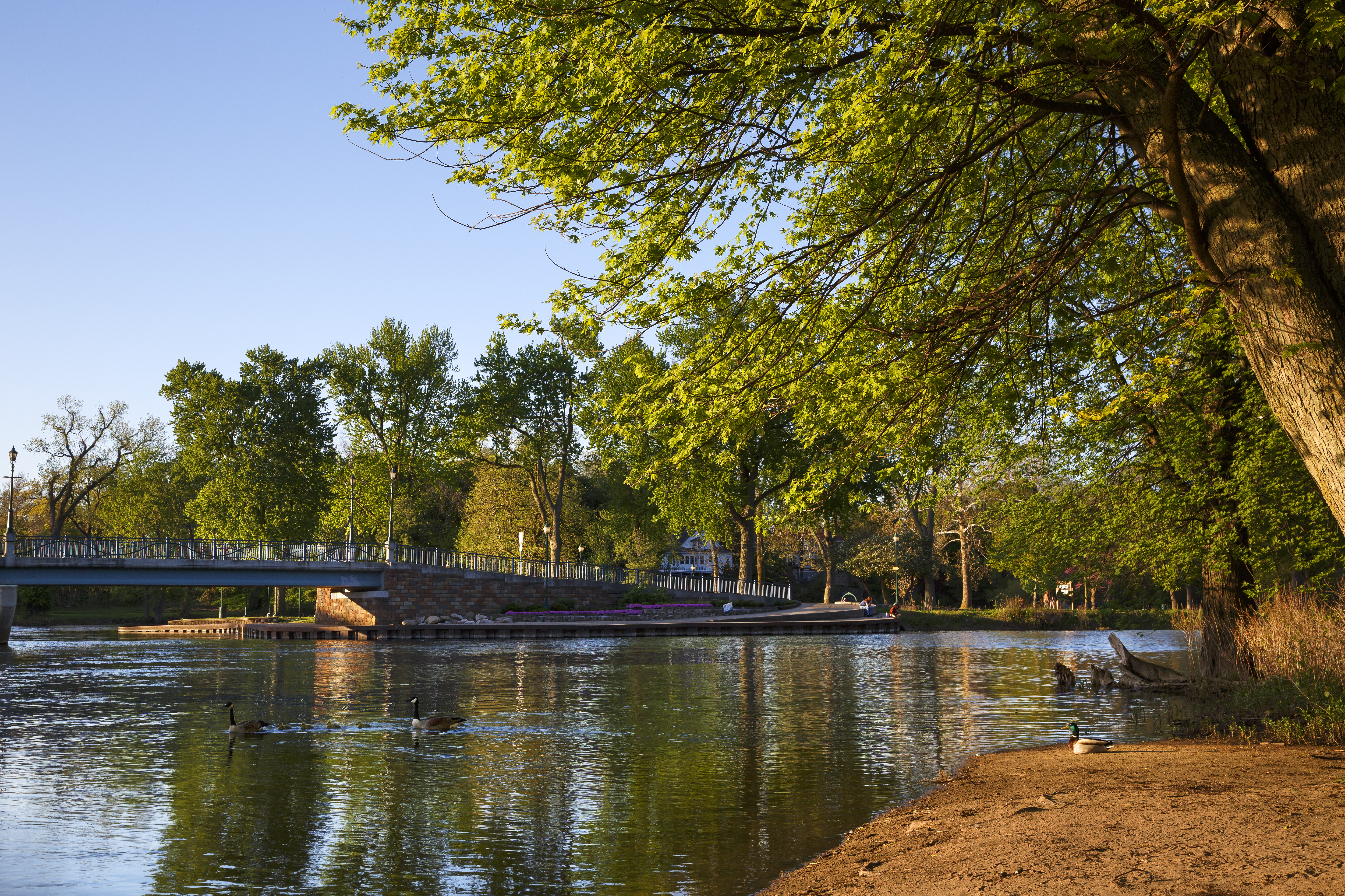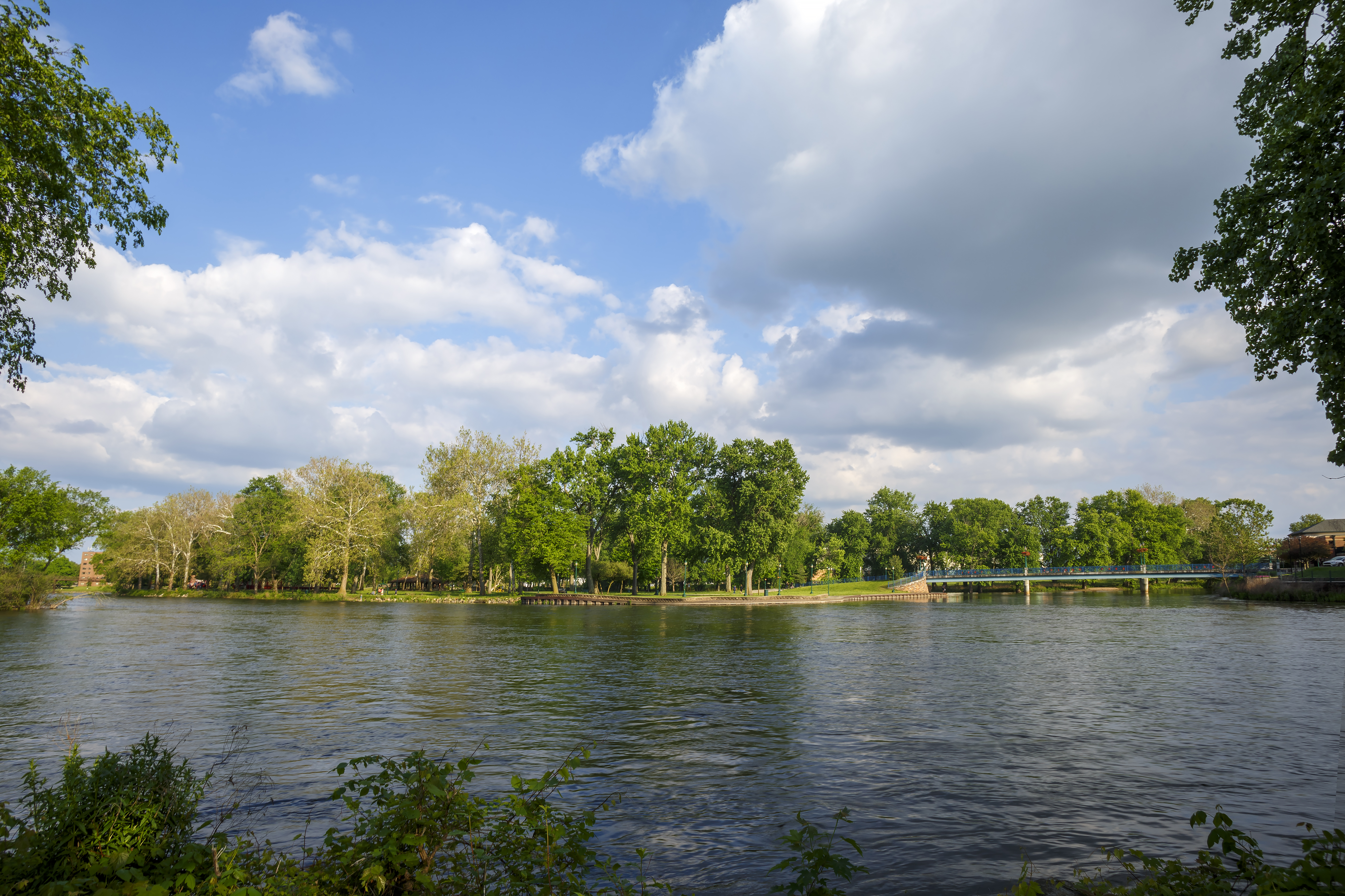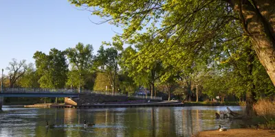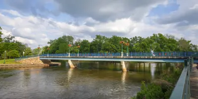 Island Park, nestled downtown at the meeting point of the Elkhart and St. Joseph Rivers, is a scenic community hub. The park features a charming bandstand, a playground, and walking paths, making it perfect for leisurely strolls, family outings, or riverside relaxation. Easily accessible on foot from nearby bridges, Island Park also hosts popular events such as the annual Rhapsody Arts & Music Festival and offers amenities for fishing and community gatherings.